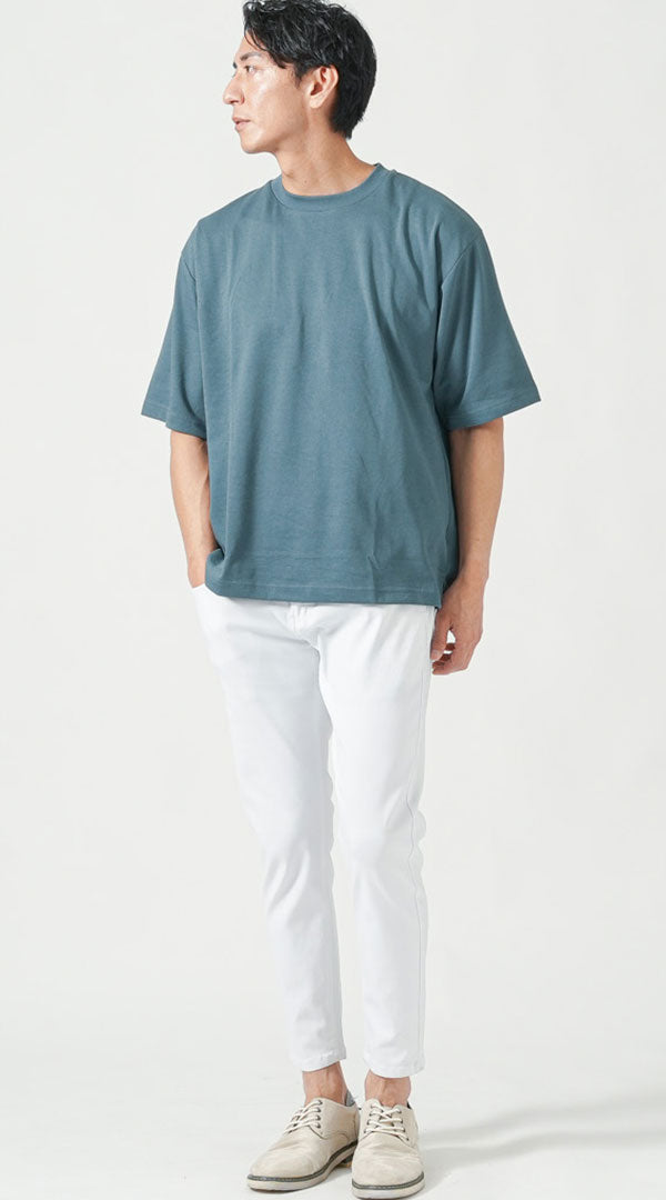 青緑がかったTシャツと白パンツのコンビネーションは、街歩きやショッピングに映える爽やかさ。