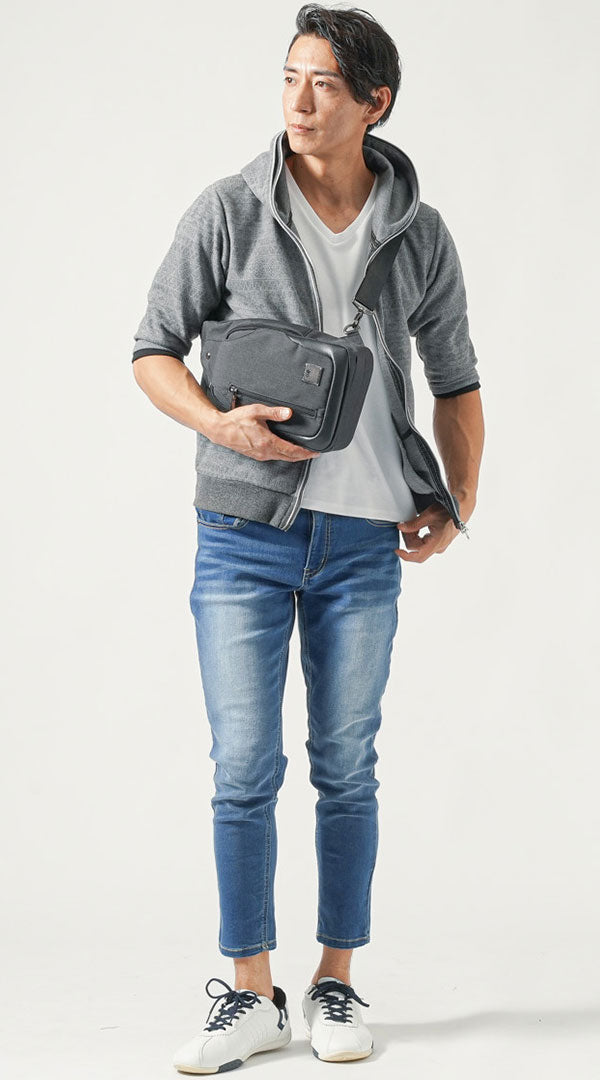 旅行やアウトドアでは気温差に備えたコーデが活躍。グレーのパーカーは脱ぎ着しやすく、白Tとの組み合わせで軽やかさを確保。
