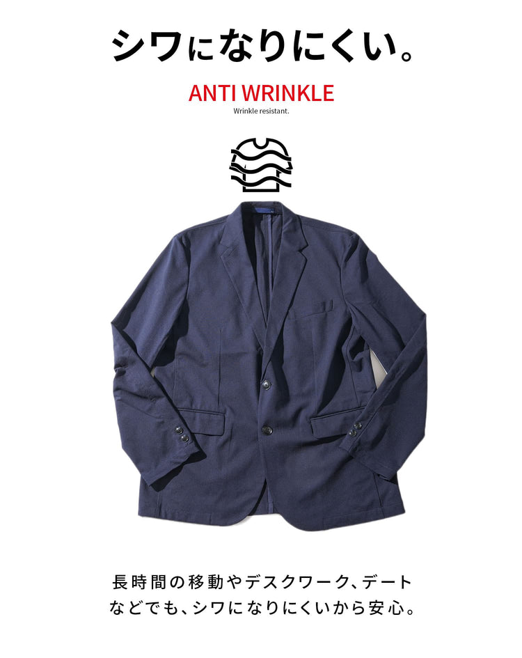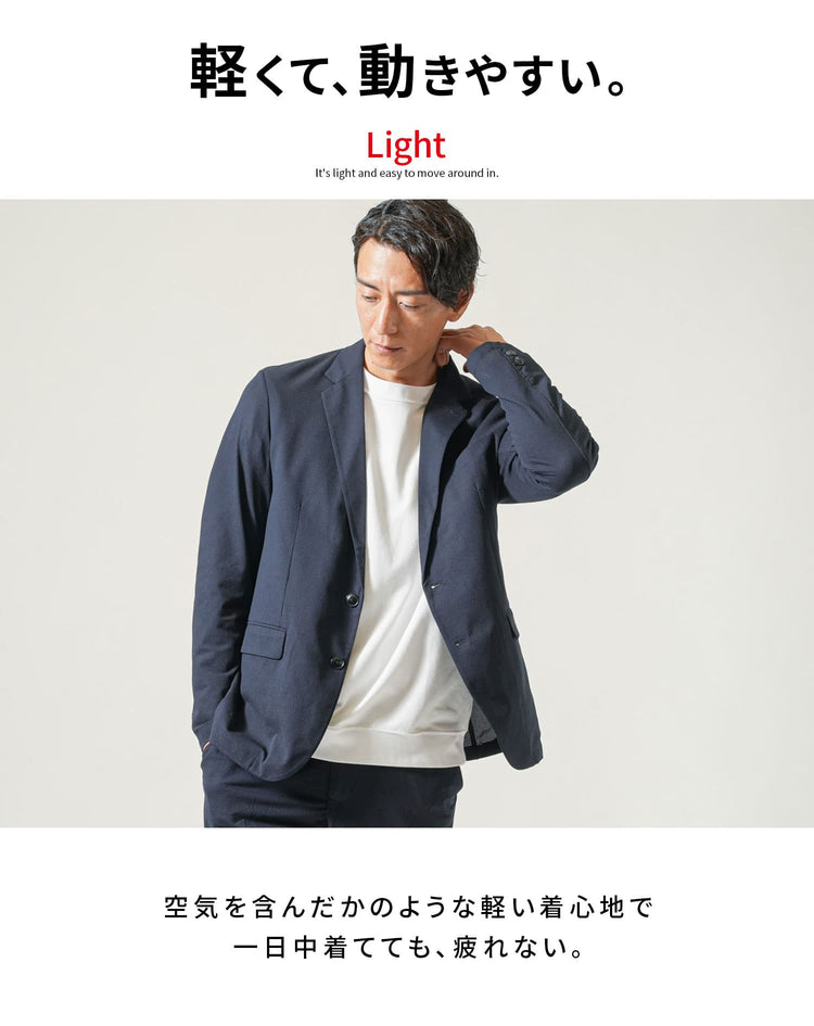 ジャケットを羽織っても軽やかで堅すぎないから、第一印象も爽やか。脱いでもシワになりにくく、安心。