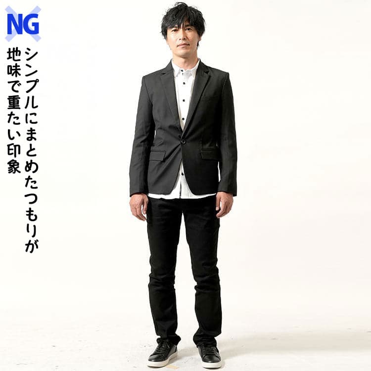 注意点として黒ジャケットで引き締めてスマートな印象になっているので、パンツのシルエットが太いとなんかだらしないイメージになります。