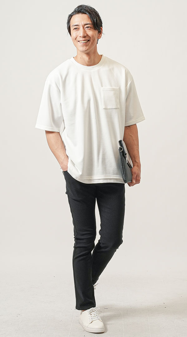 ちょいワル・イケオジメンズ夏の3点コーデセット 白黒半袖ブルゾンジャケット×白半袖Tシャツ×黒スリムチノパンツ