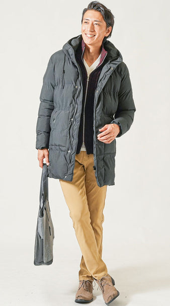 50代メンズ冬服3点コーデセット 黒中綿ダウンジャケット×白タートルネックニット×カーキチノパンツ