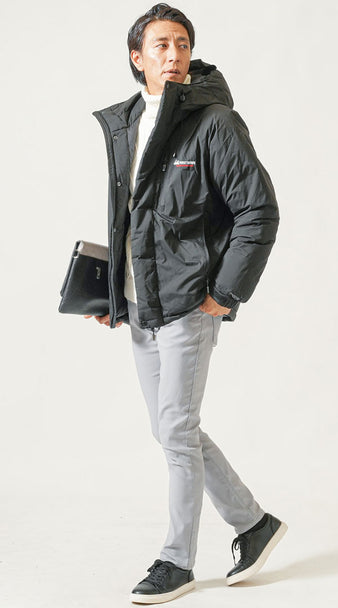 ダウンジャケット×タートルネックニット×パンツ