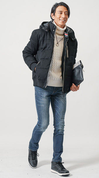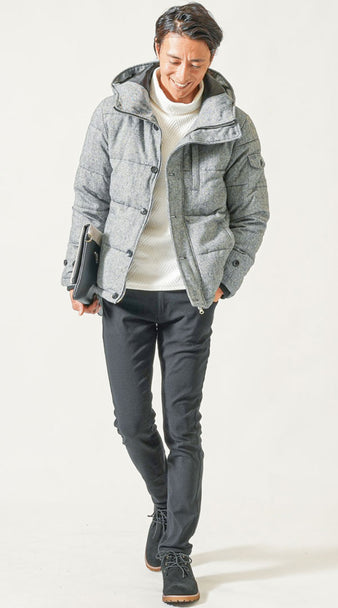40代メンズ冬の3点コーデセット グレーツイードダウンジャケット×黒タートルネックニット×ネイビースリムデニムパンツ