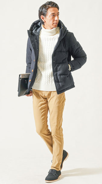 ネイビーダウンジャケット×タートルネックニット×ベージュチノパンパンツの3点冬コーデセット