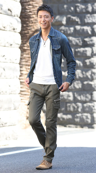 30代メンズ全身3点コーデセット インディゴデニムジャケット×白長袖Tシャツ×カーキカーゴパンツ