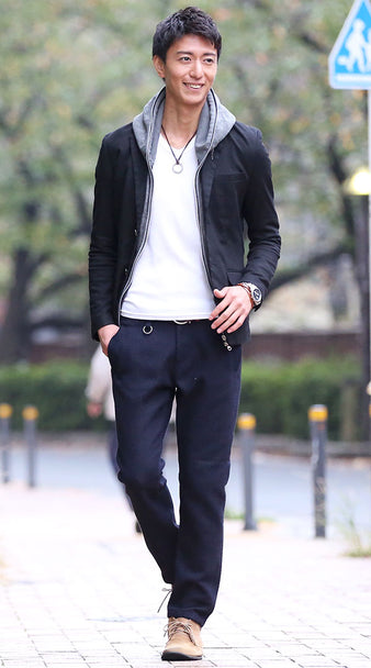 さきほどのネイビー色のパンツに合う色として黒色アウターをセレクトしたコーデと同じ配色。