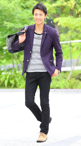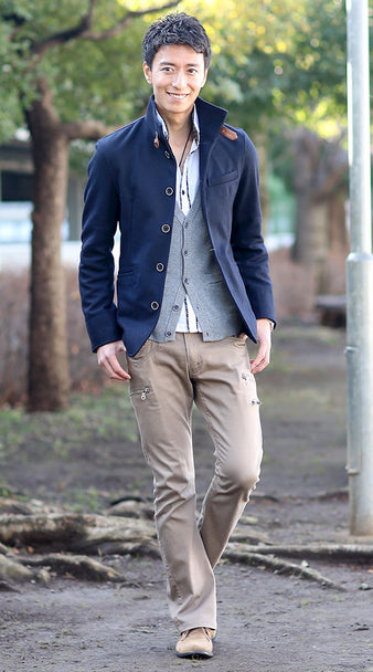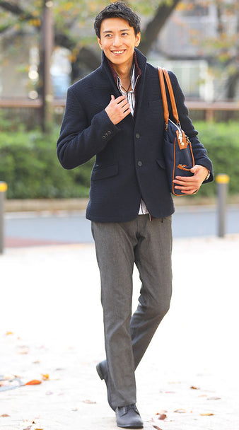 ネイビー色のジャケットにグレー色のズボンを合わせたコーデ