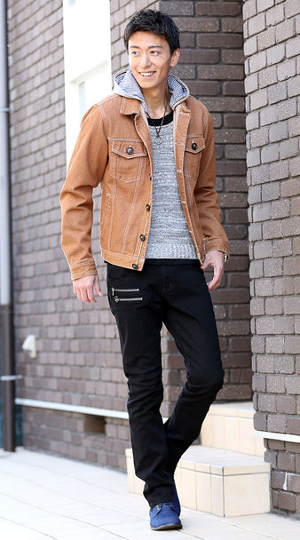 コーデ例|キャメルデニムジャケット×グレーメッシュニット×ブラックストレッチパンツ×デニム生地レースアップブーツ