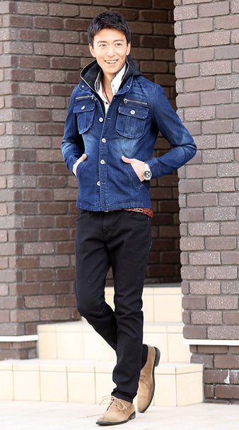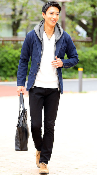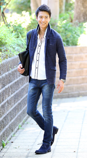 コーデ例|ネイビーイタリアンカラージャケット×ホワイトシャツ×デニムパンツ×ネイビースエードチャッカブーツ