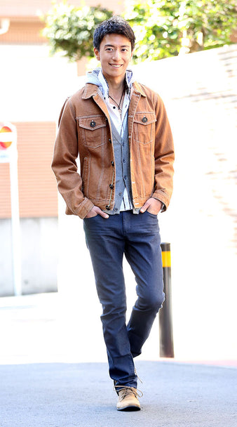そこで、靴に明るい色である茶色を合わせることで全体バランスをとる配色コーデになります。