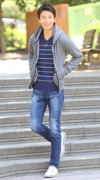 ネイビー色と相性のいいグレー色をパンツに使い清潔感アップ