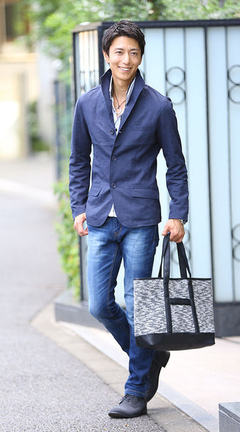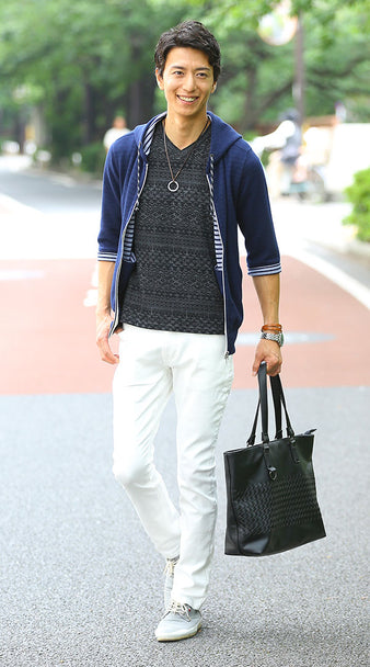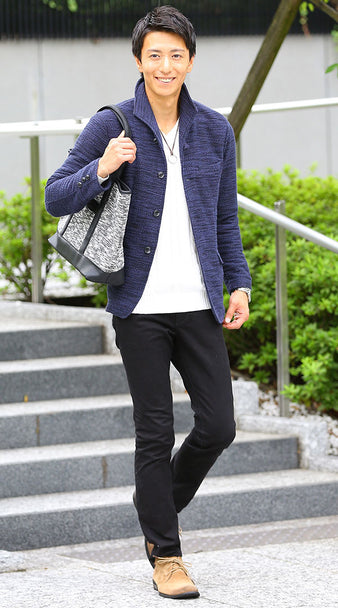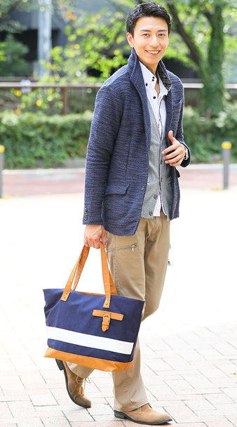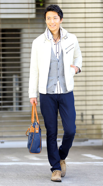 コーデ例|ネイビートートバック×ネイビージャケット×白シャツ×グレーカーディガン×ベージュチノパン