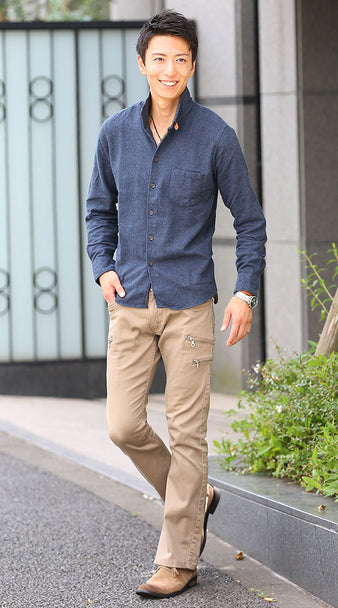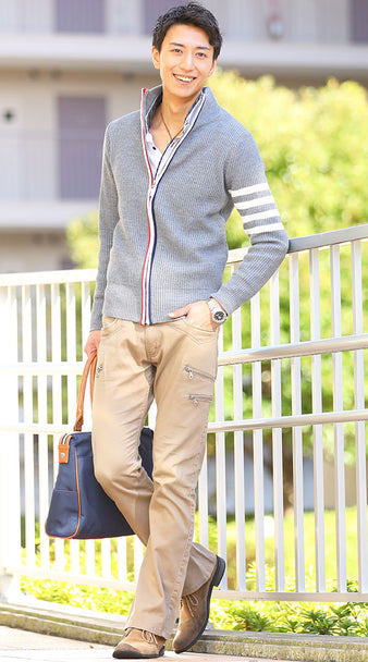 コーデ例|ネイビートートバック×グレースタンドカラーニット×白シャツ×ベージュチノパン