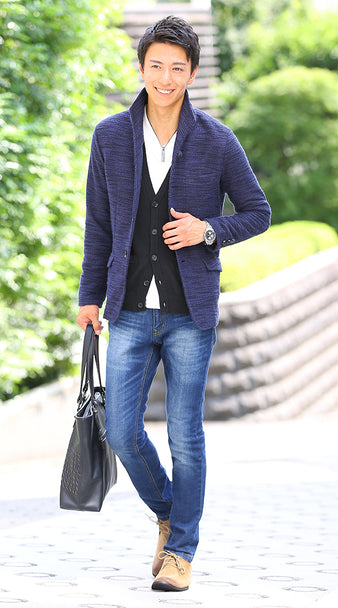 黒色のジャケットだと、上下黒になり、暗くなりがちなところをネイビー色のニットジャケットで明るさを。
