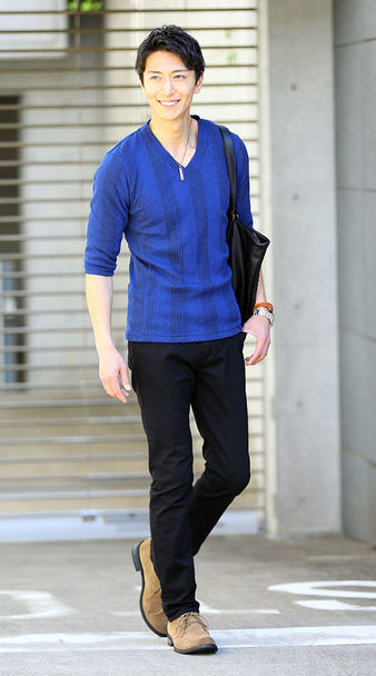 コーデ例|ネイビー7分袖Vネックカットソー×ブラックスキニーパンツ
