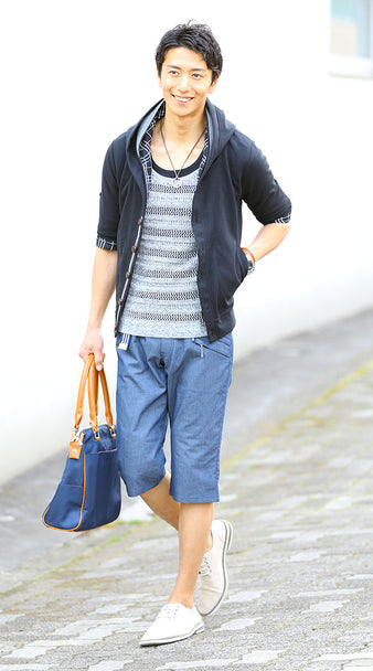 コーデ例|ブラック5分袖パーカー×グレーメッシュニット×ネイビーヘリンボーンクロップドパンツ