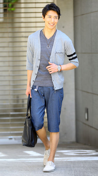 ネイビー色と相性のいいグレー色をパンツに使うと、グレー色の面積が大きくアップ。