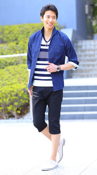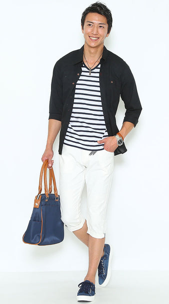コーデ例|ブラック麻混7分袖シャツ×ボーダーカットソー×ホワイトクロップドパンツ×デニム生地ローカットスニーカー