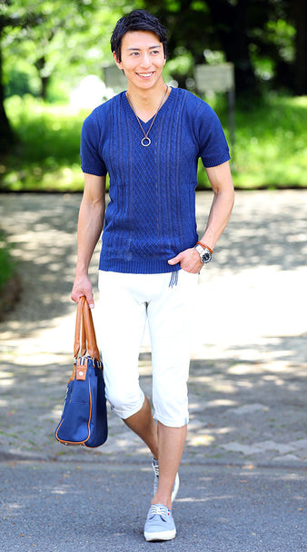 コーデ例|ネイビー麻混サマーニット×ホワイトクロップドパンツ