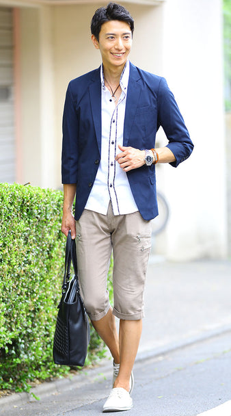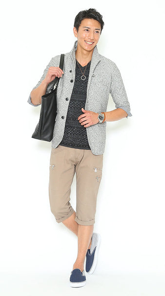 コーデ例|杢グレー7分袖ジャケット×ブラックデザインカットソー×ベージュクロップドパンツ×ネイビースリッポンスニーカー