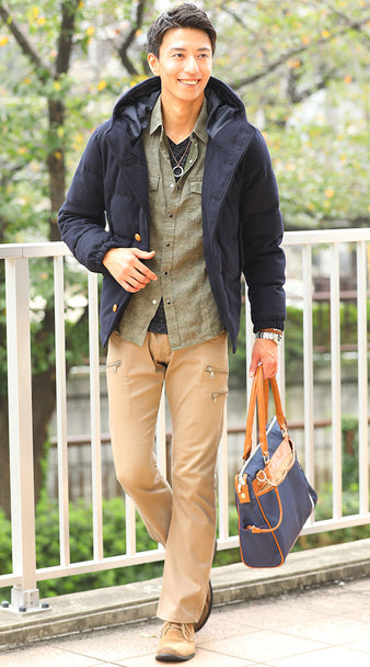 少し上級者コーデになるけど、ネイビー色と相性のいいカーキ色をとりいれるとこの冬、1つ上のレベルのコーデをつくれるようになります。