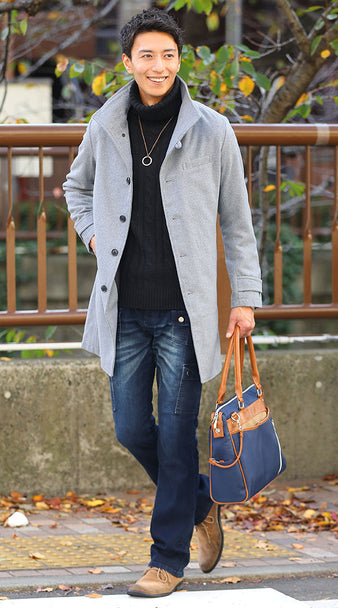 コーデ例|ネイビートートバック×グレーイタリアンカラーロングコート×ブラックタートルネックニット×デニムカーゴパンツ