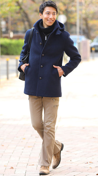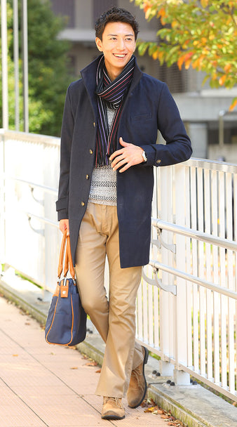ネイビーはウールを使用した冬コートに使うと、冬の暖かいスマートコートコーデをつくることができますよ。