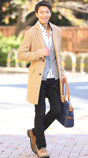 コーデ例|ネイビートートバック×ベージュチェスターコート×グレーカーディガン×白シャツ×ブラックスキニーパンツ
