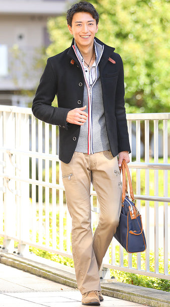 コーデ例|ネイビートートバック×ブラックスタンドコート×グレーニット×白シャツ×ベージュチノパン