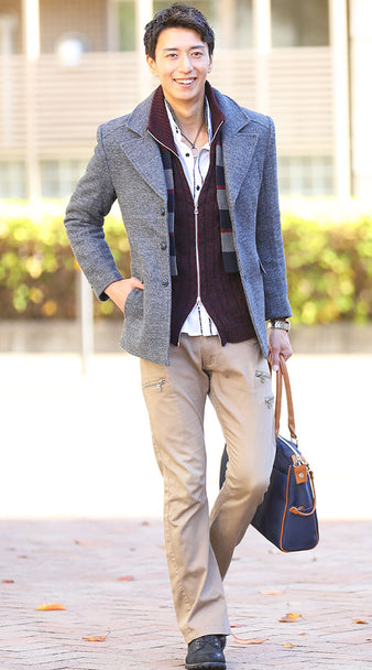 コーデ例|ネイビートートバック×グレーマフラー付きコート×ボルドースタンドカラーニット×白シャツ×ベージュチノパン