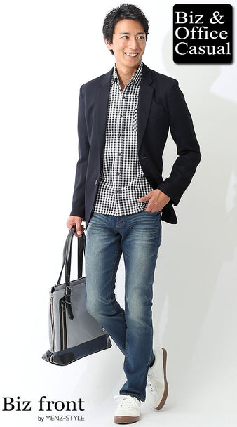 ネイビーのテーラードジャケットのインナーにギンガムチェックシャツ、パンツにダメージジーンズを合わせたカジュアルスタイル。ジーパンを使ったジャケパンスタイルでもインナーにチェックシャツを使うとよりカジュアルな着こなしになります。