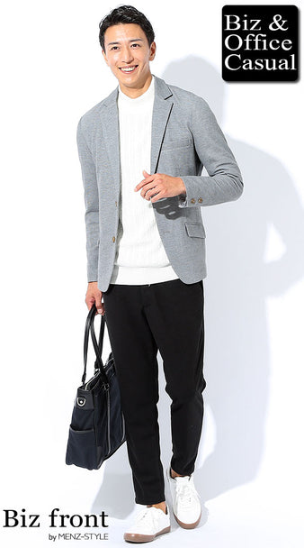 白スニーカー×グレーテーラードジャケット×白ニット×黒パンツ