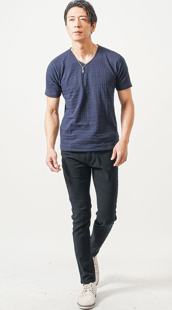 ネイビーのスリムTシャツが上半身をシャープに見せ、黒スキニーパンツとの引き締めコンビで縦ラインが強調されるスタイルアップコーデ。シンプルながら凹凸のある生地が夏らしい立体感を生み出し、無地T一枚でも洗練された印象に。黒スキニーはジャストレングスで足元をスッキリと見せつつ、ベージュのシューズで重たさを軽減。夏でも“暗くならない黒スキニー”を実現した、大人のための上品カジュアルです。