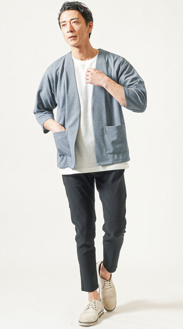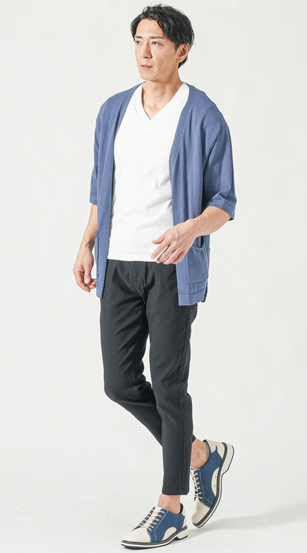 30代メンズ3点コーデセット ブルー5分袖カーディガン×白半袖Tシャツ×黒ストレッチチノパンツ