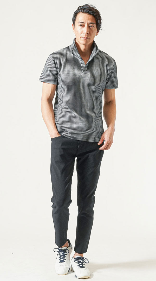 「夏の黒パンツは重たく見える…」そんな悩みを解消するのが、襟付きのストライプポロシャツを合わせたこちらのコーデ。清潔感のあるトップスで軽やかさを演出しつつ、黒スキニーパンツでスマートな印象を引き締めます。足元は白スニーカーで抜け感を加え、全体のバランスも◎。40代男性の大人の品格と爽やかさを両立する夏スタイルです。