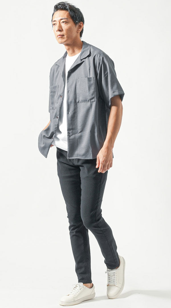 30代メンズ夏の3点コーデセット チャコールグレー半袖オープンカラーシャツ×白半袖Tシャツ×黒スリムアンクルチノパンツ