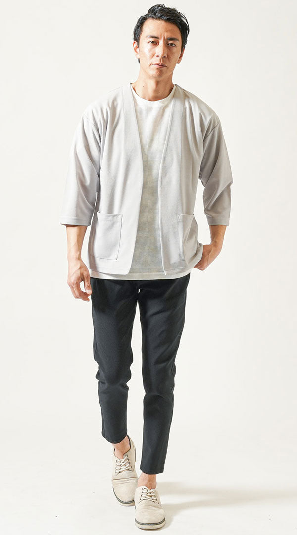 「黒スキニーが重たく見えがち…」そんなときに取り入れたいのが、ライトグレーのサマーカーディガン。明るいトーンの羽織りは、コーデ全体を柔らかく見せ、涼感もプラス。ワッフル素材の白インナーで清潔感を引き立てながら、黒スキニーでしっかり引き締めてバランスの取れた装いに。冷房対策や気温差のある日にも活躍する、夏にちょうどいい羽織りスタイルです。