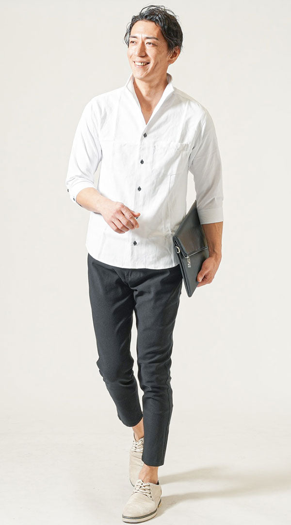 40代メンズ2点コーデセット 白7分袖カプリシャツ×黒スリムストレッチチノパンツ