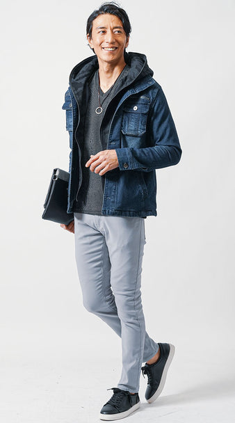 ネイビーのデニムジャケットはライトグレーパンツと相性の良い色合わせ。デニムジャケットのようなカジュアルなトップスでもスマートなライトグレーパンツと合わせると洗練された印象になります。