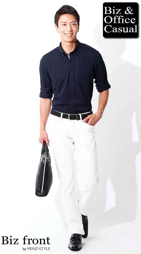 白ポロシャツにダークネイビーのスラックスを合わせた、オフィスにぴったりな爽やかコーデ。