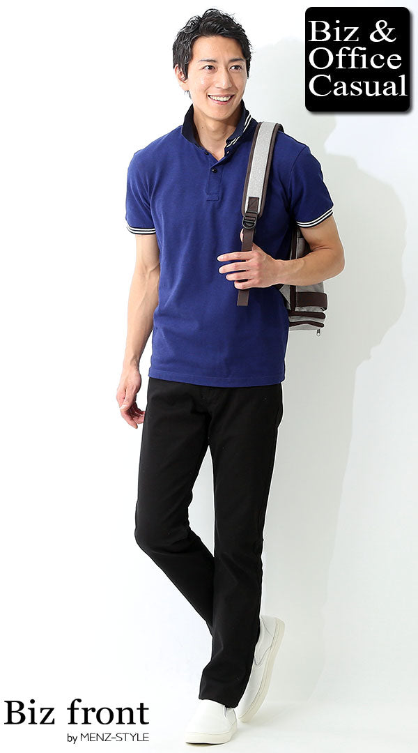 濃い・暗い色のパンツ×白ポロシャツコーデ
