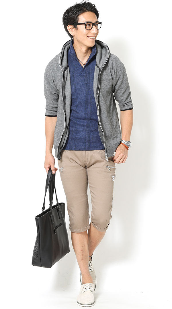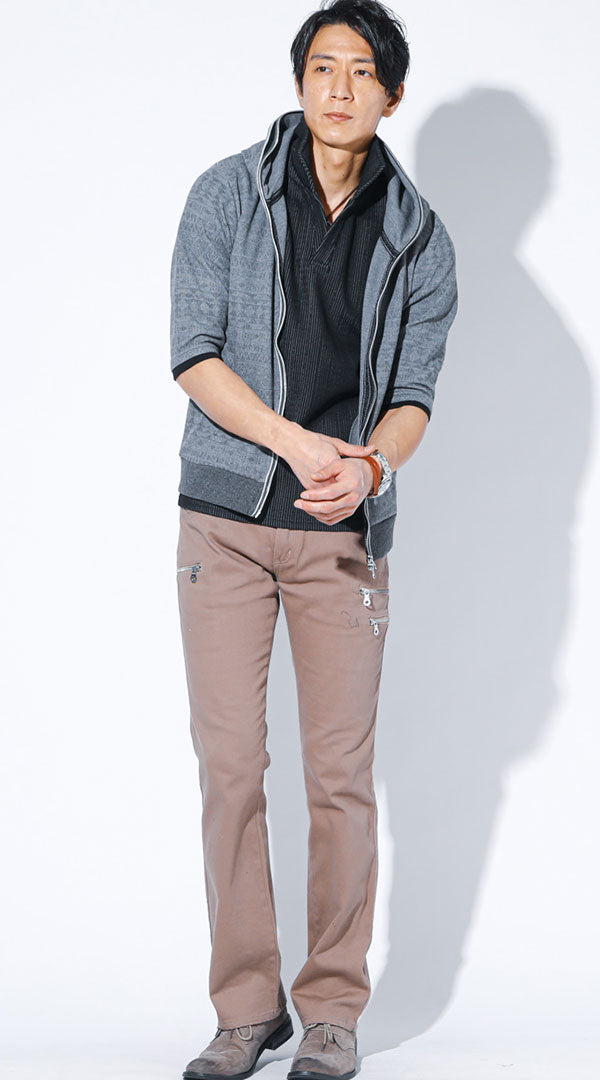 カフェデート服メンズ3点コーデセット グレー5分袖パーカー×白7分袖ポロシャツ×ベージュスリムチノパンツ