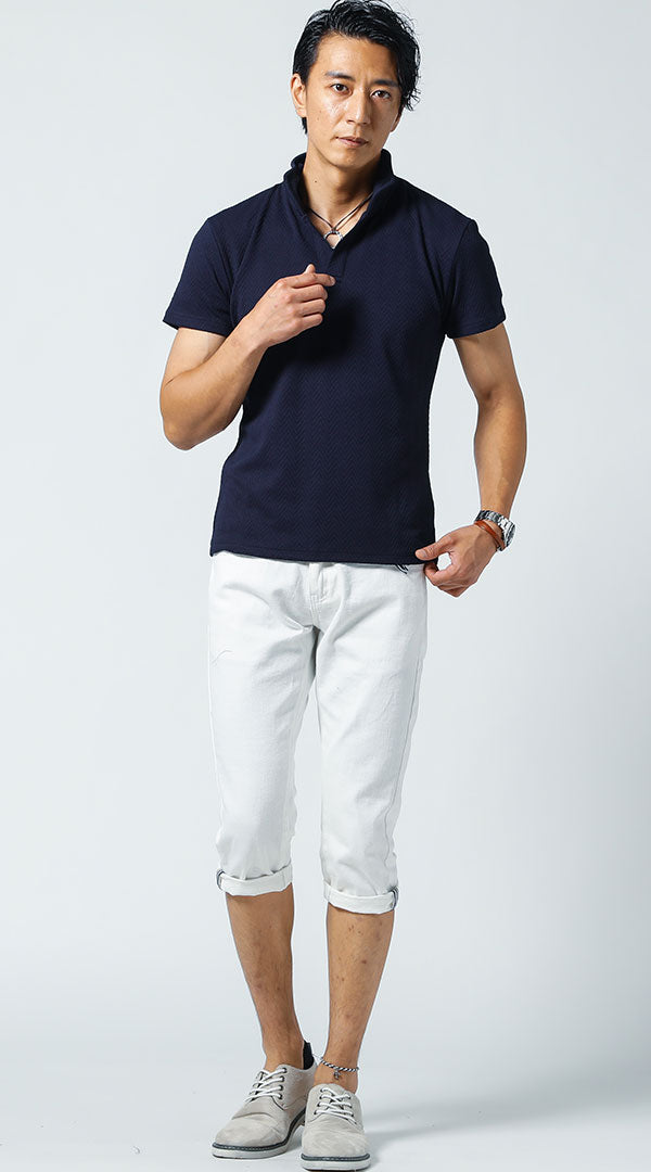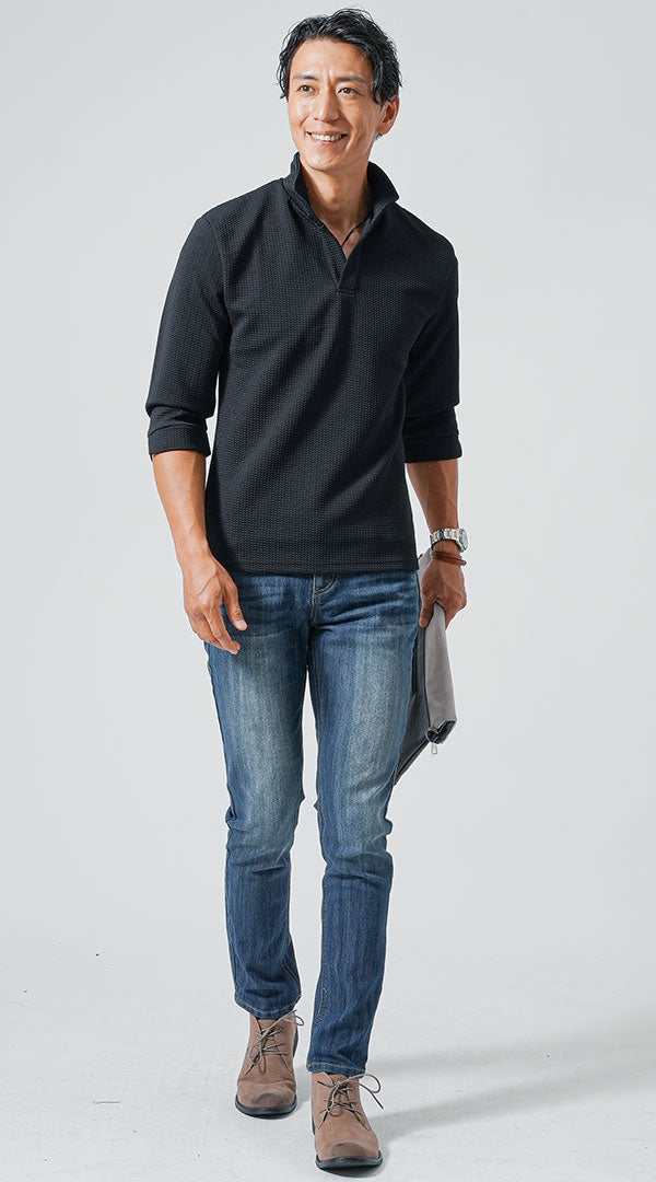 【ハーフジップ半袖スタンドカラーポロシャツ×デニム】