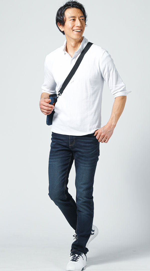 白ポロシャツに濃紺デニムを合わせた清潔感のあるカジュアルコーデ。