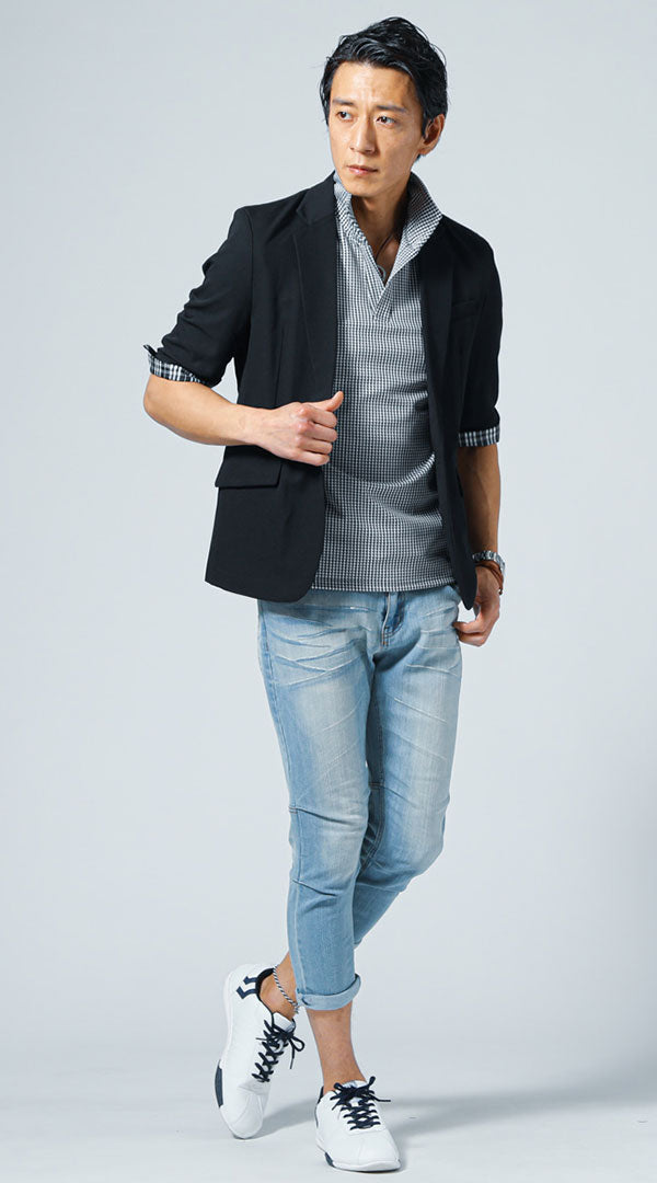 40代メンズ夏服全身3点コーデセット 黒5分袖テーラードジャケット×白半袖ポロシャツ×ブルーアンクルデニムパンツ