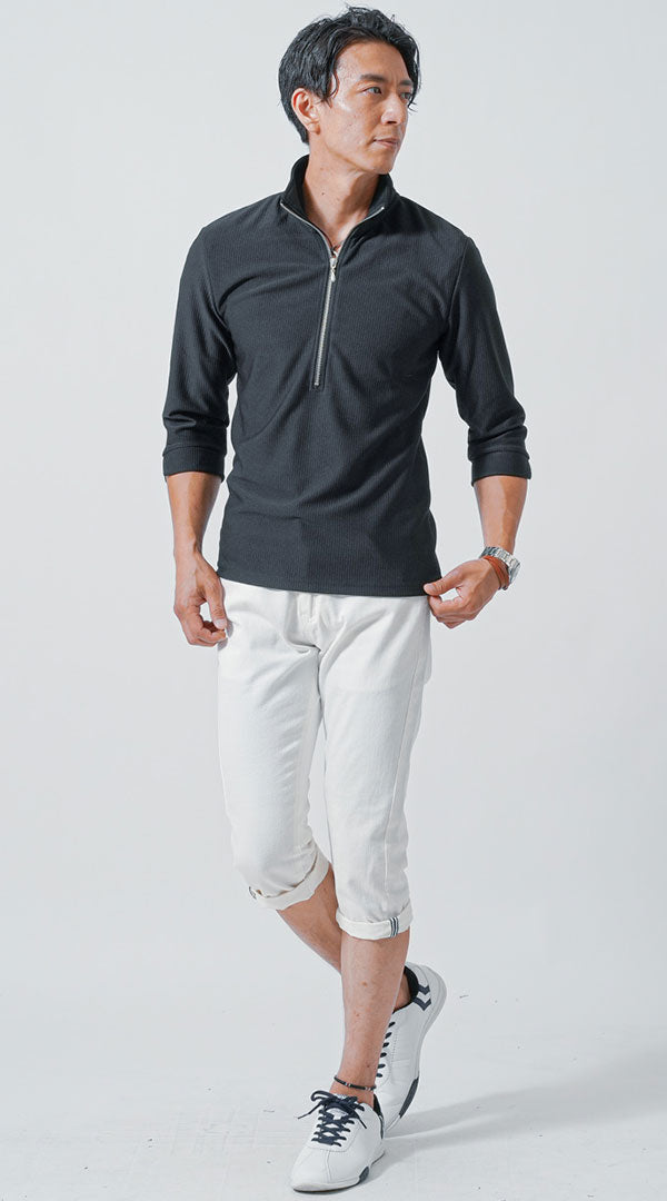 ハーフジップとスタンドカラーが男らしく決まるスタイル。ポロシャツが細身なのでスタイリッシュな印象で着こなせます。