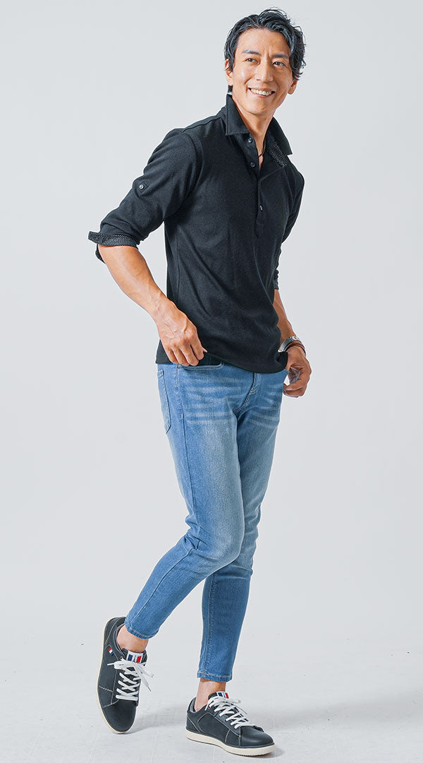 黒ポロシャツの重厚感にライトウォッシュデニムで抜け感をプラスした軽快コーデ。