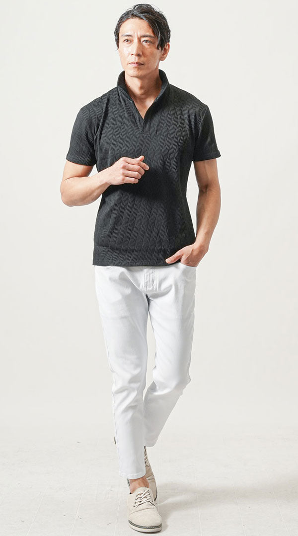 40代メンズ夏の2点コーデセット 黒7分袖ポロシャツ×白ストレッチテーパードパンツ