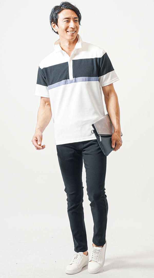 全体を引き締める黒パンツが、清潔感あふれる白ポロシャツをさらに際立たせ、スマートな印象を与えます。